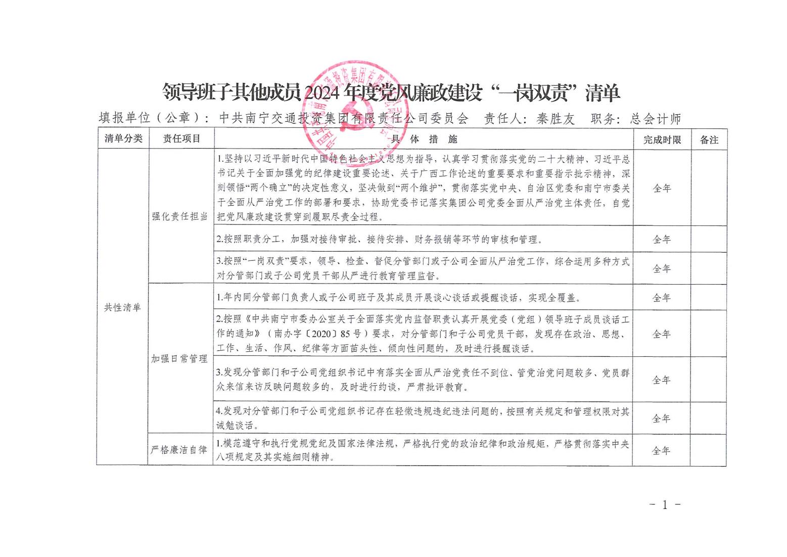 領(lǐng)導(dǎo)班子其他成員2024年度黨風(fēng)廉政建設(shè)“一崗雙責”清單(六)