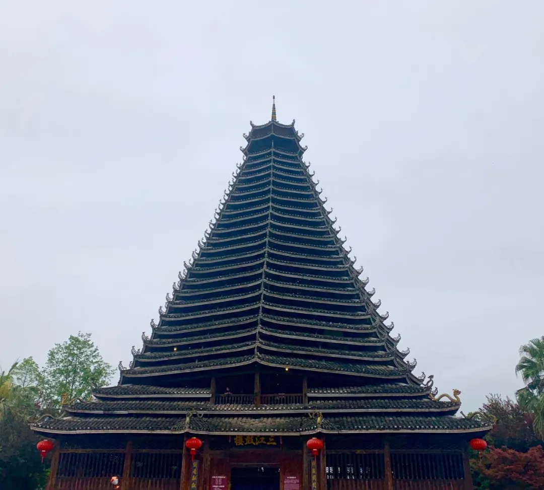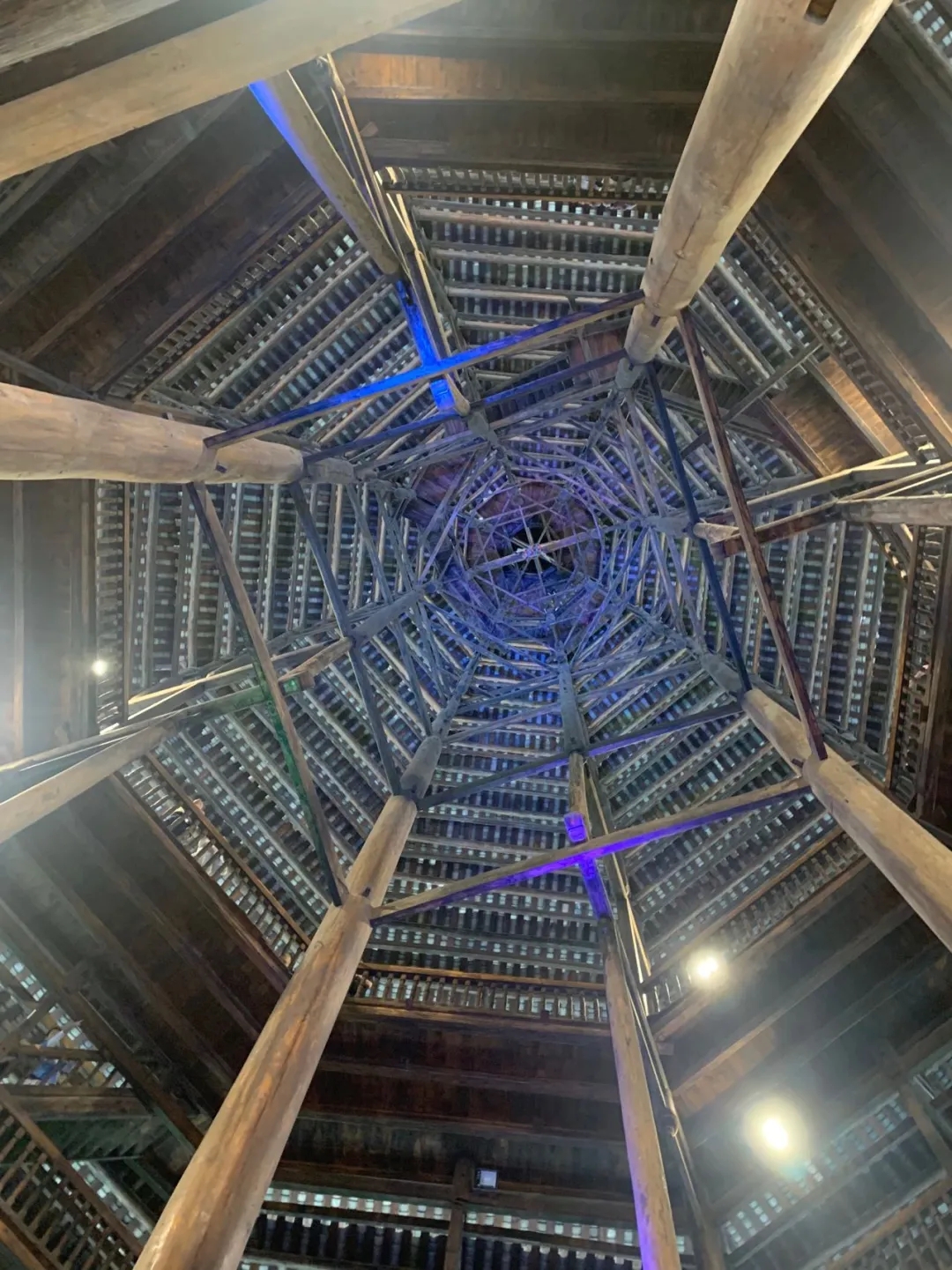 仰觀閃閃魔幻,感受侗族建設(shè)的精美藝術(shù),把疏密、粗細、剛?cè)岬韧昝赖亟Y(jié)成一個整體,展現(xiàn)侗族工匠的精美建筑技藝。不用一顆鐵釘,結(jié)構(gòu)十分嚴謹穩(wěn)固。樓內(nèi)四根杉木大柱直徑都超過70厘米,樹齡均在百年以上,這在鼓樓建筑史上是唯一的。