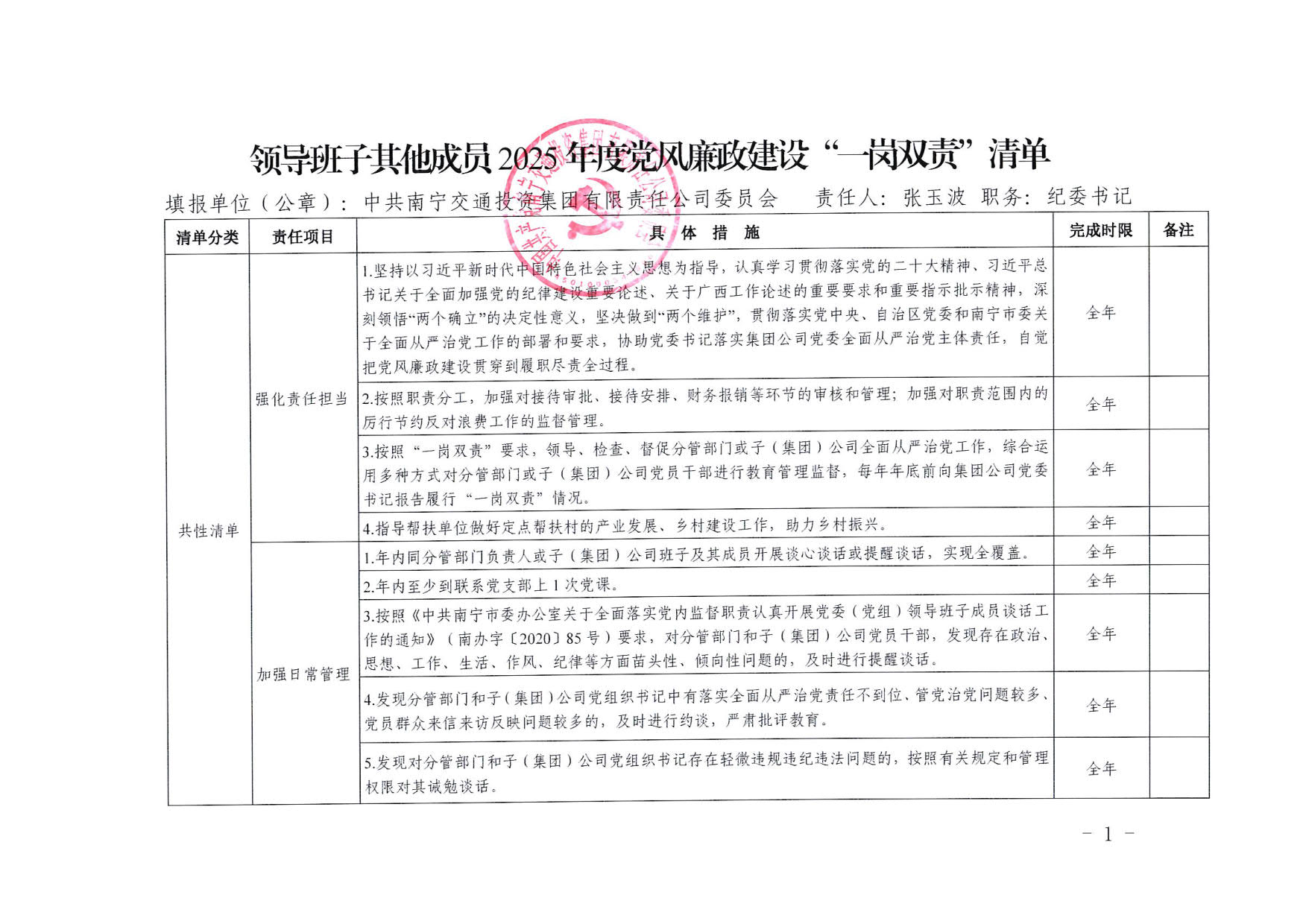 南寧交投集團領導班子其他成員2025年度黨風廉政建設“一崗雙責”清單(一)