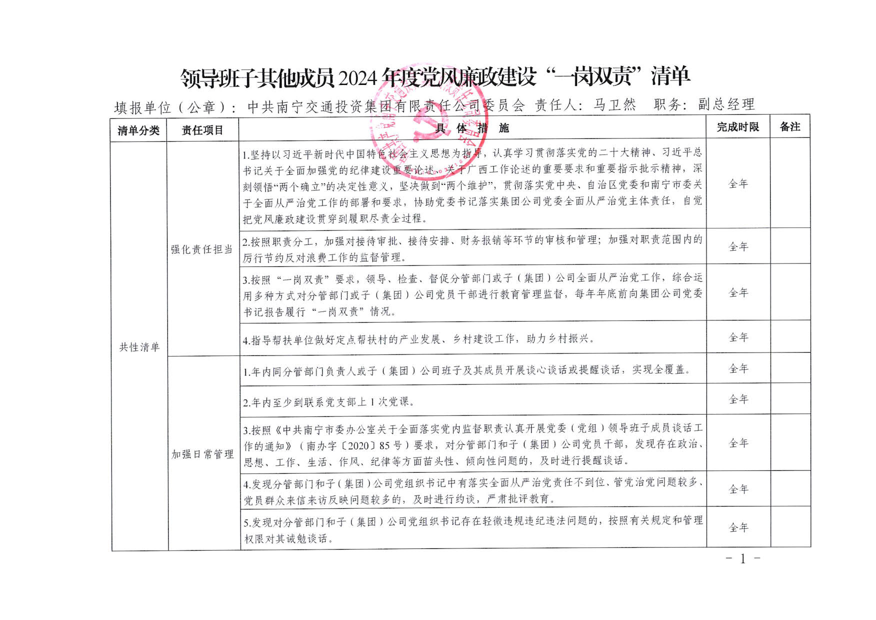 南寧交投集團(tuán)領(lǐng)導(dǎo)班子其他成員2025年度黨風(fēng)廉政建設(shè)“一崗雙責(zé)”清單(六)